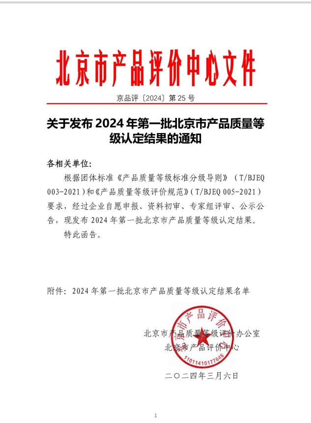 关于发布2024年第一批北京市产品质量等级认定结果的通知