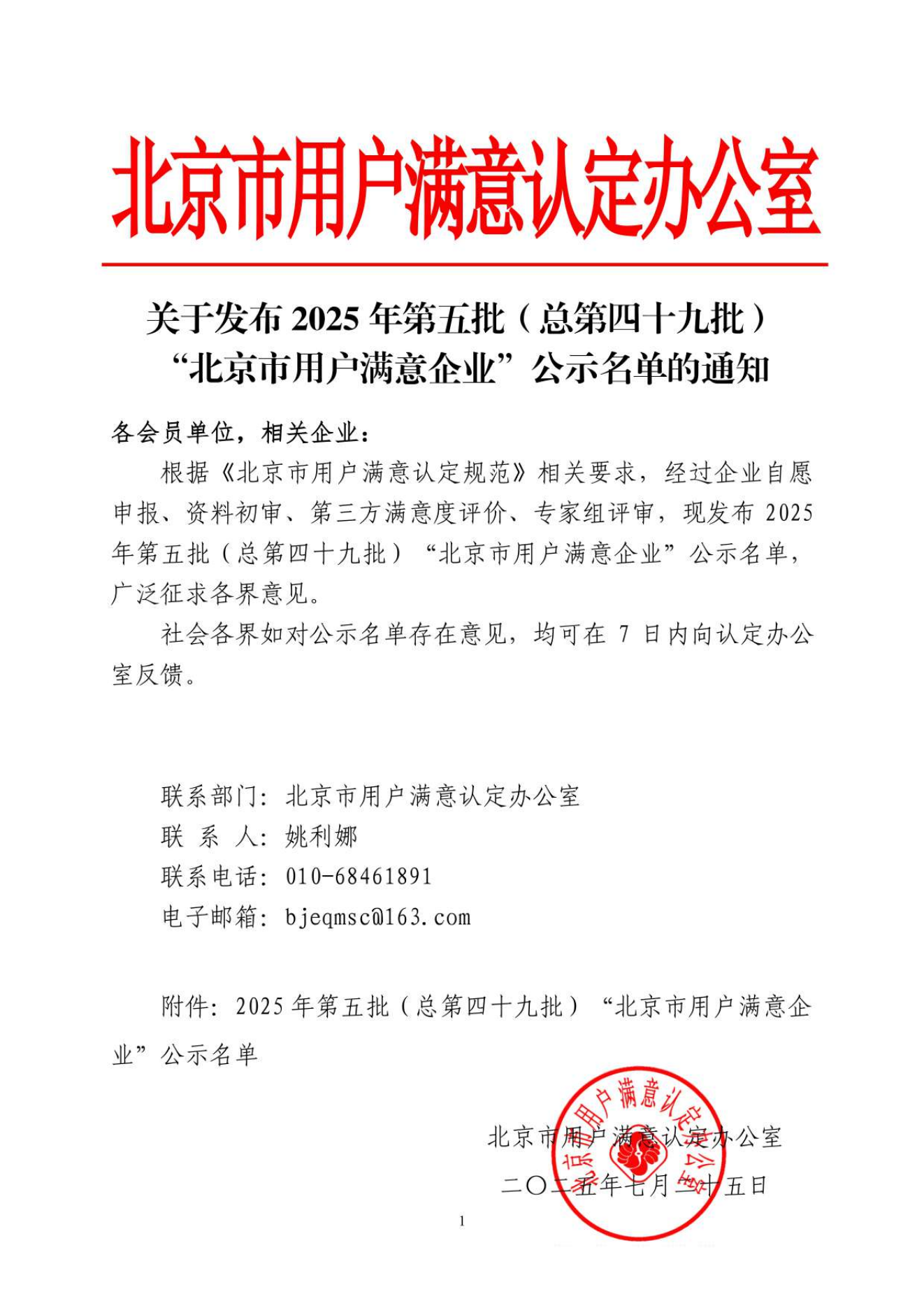 关于发布2025年第五批(总第四十九批)“北京市用户满意企业”公示名单的通知