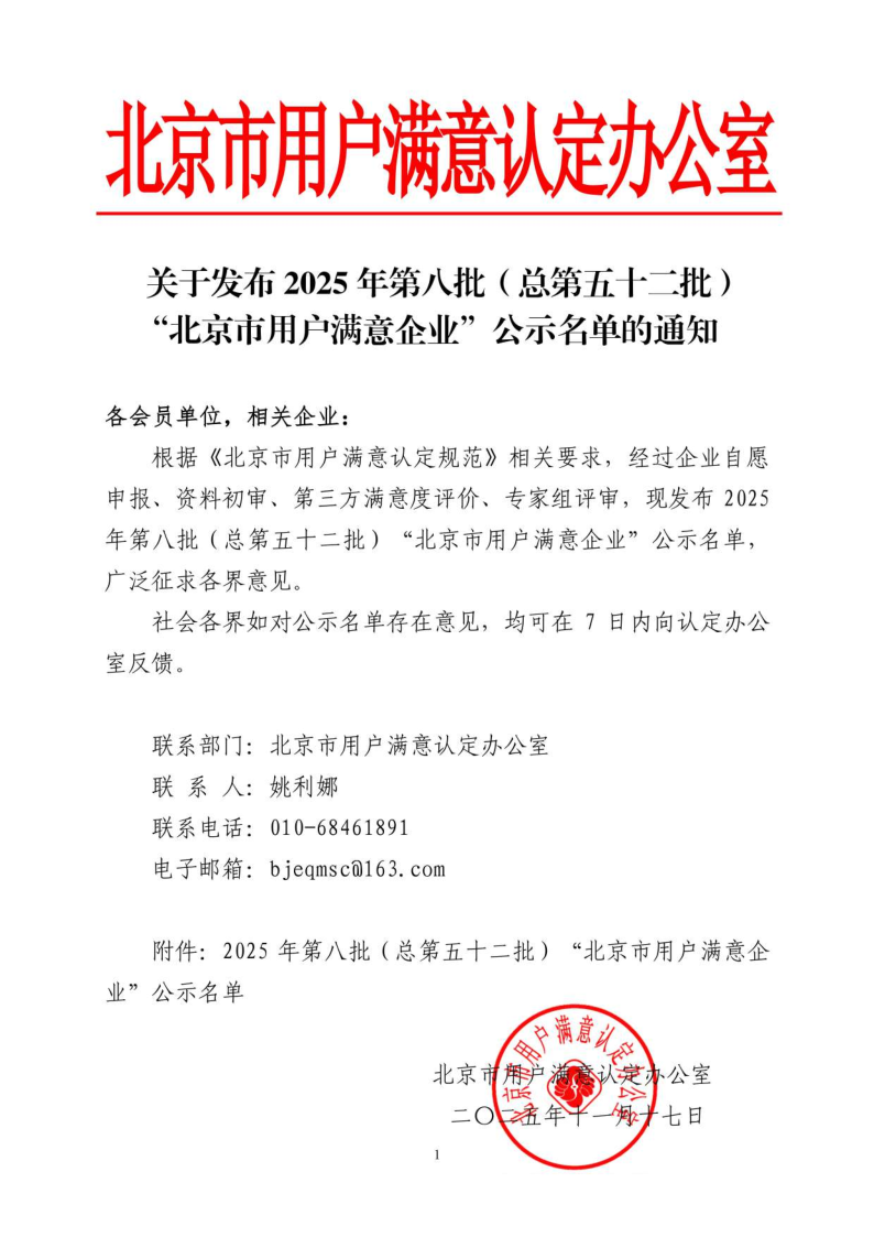 关于发布2025年第八批(总第五十二批)“北京市用户满意企业”公示名单的通知