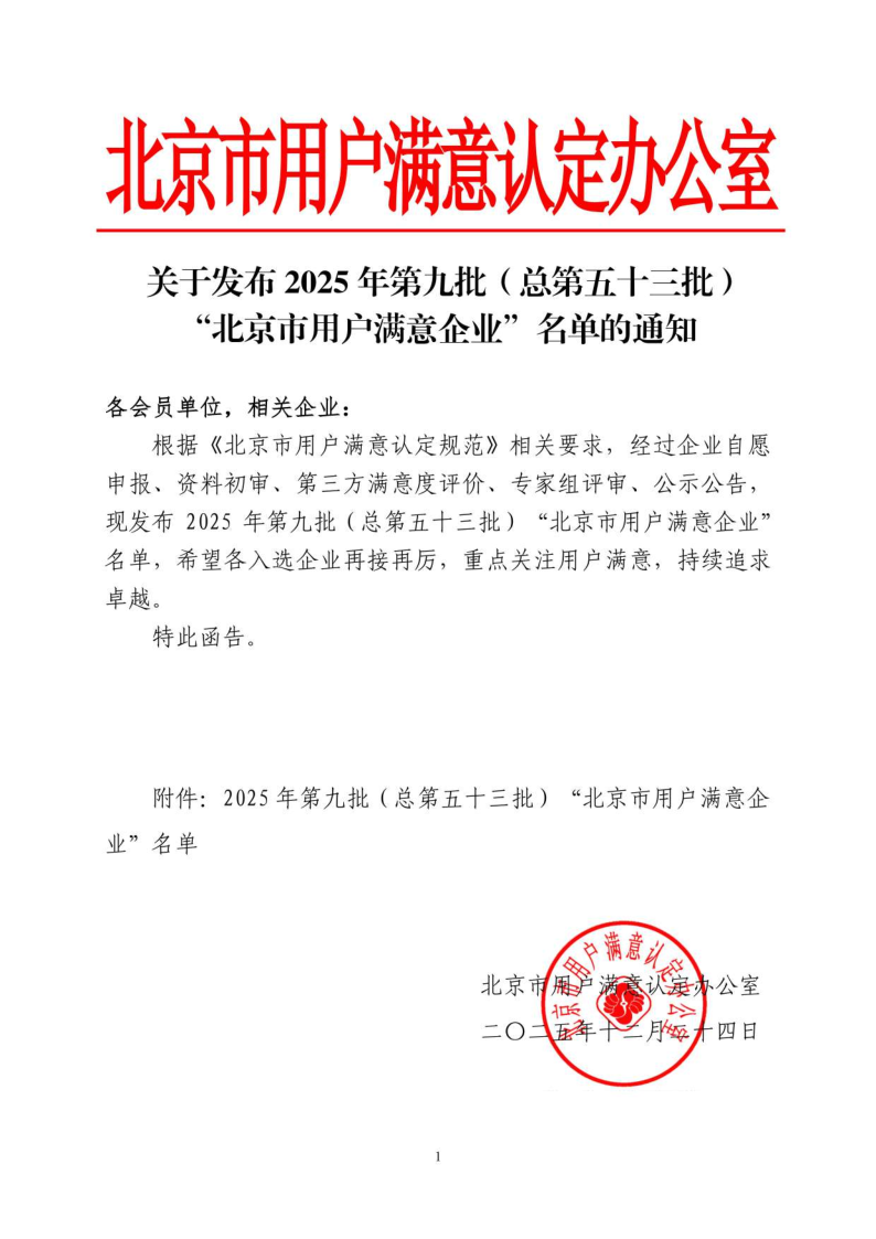 关于发布2025年第九批(总第五十三批)“北京市用户满意企业”名单的通知