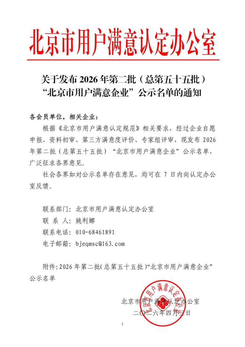 关于发布2026年第二批(总第五十五批)“北京市用户满意企业”公示名单的通知