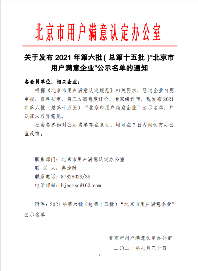 关于发布2021年第六批(总第十五批)“北京市用户满意企业”公示名单的通知